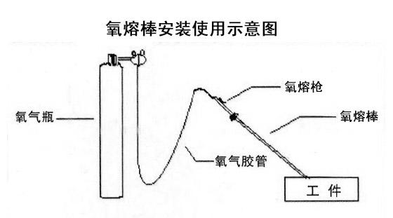 氧熔棒需要配合氧熔槍和氧氣瓶才能使用,因此,在使用氧熔棒之前,我們首先要對其進行正確安裝,下圖是氧熔棒工作時的安裝示意圖。
